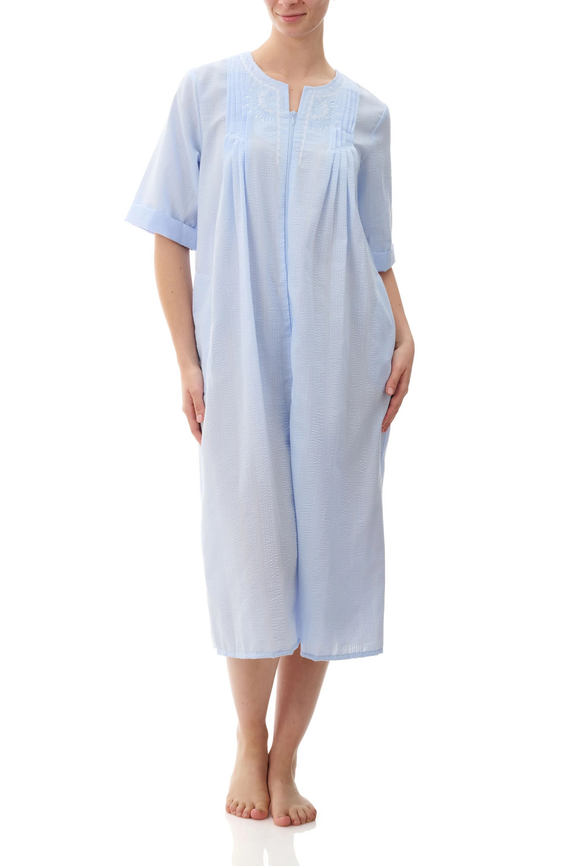 Pretty in soft blue, our seersucker mid length zip brunchcoat is the ideal cover up for Summer. This brunchcoat has a half sleeve with cuff. Pretty embroidery with pleats from the shoulders. Features a full zip front opening. Side inset pockets. Can be worn over matching nighties to complete your summer sleepwear look.