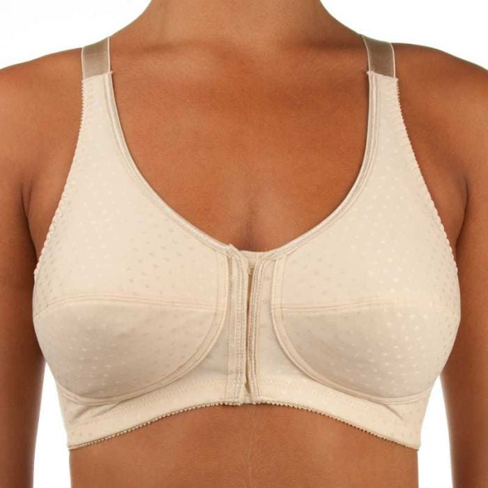 This stunning mastectomy bra offers ease of use with its front and back closing features. Made with delicate Jacquard fabric and adjustable shoulder straps, it provides added shape and comfort. The bilateral cotton blend pockets allow for comfortable placement of a breast form.