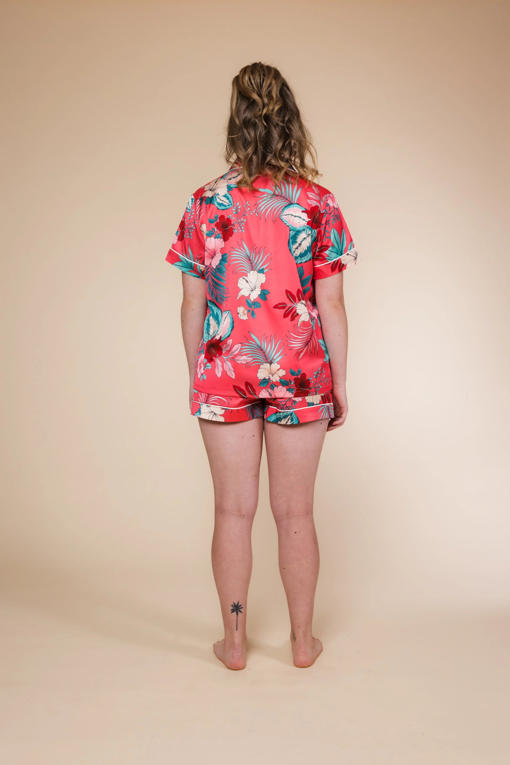Inspired by the vibrant colours of the tropics, these PJ's effortlessly combine style and comfort. Featuring stunning pink hues, these vibrant pyjamas are sure to make a statement wherever you go. These PJ's combine a soft silky fabric, with pearl piping, custom Sunnie buttons and great attention to detail. These PJ's will bring the fun, whatever the occasion.