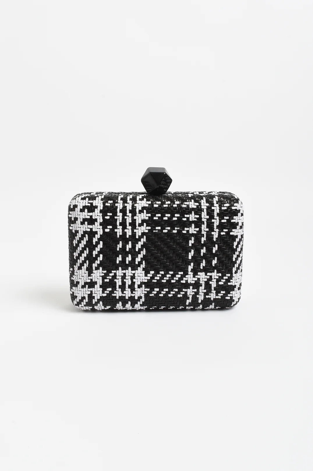 The Janey Faux Weave Check Structured Clutch in Black features a contrast check weave, tonal resin clasp, and optional chain strap.