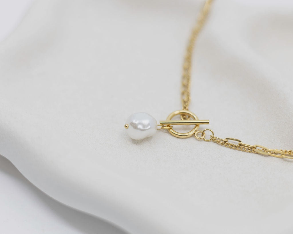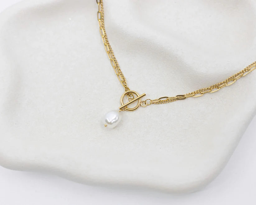 Elevate both evening and day wear with elegant Miranda, featuring a statement freshwater style pearl and a modern toggle clasp. Designed to be waterproof and hypoallergenic, it blends timeless sophistication with everyday wearability - perfect for layering or wearing solo.