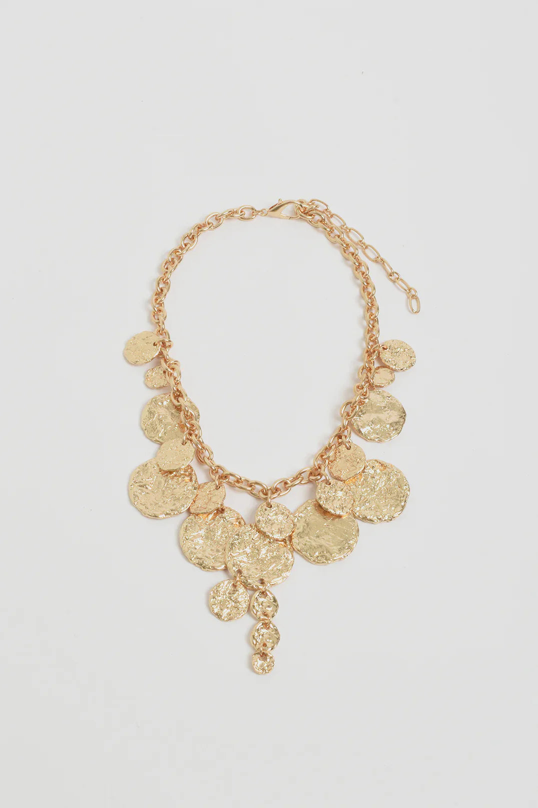 The Molten Metal Disc Necklace in Gold features assorted layered molten disc charms on a thick chain, designed for a statement look.