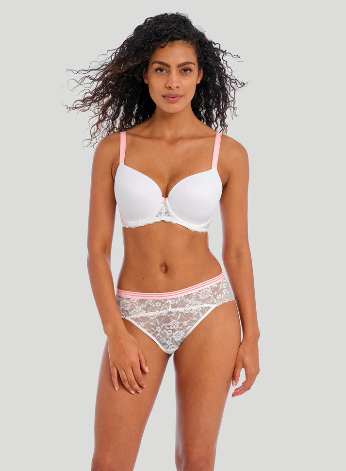 FREYA Offbeat Underwire Moulded Demi T-shirt Bra is thoughtfully crafted from soft stretch lace and seam free moulded cups, featuring the sweetest contrasting detailing. This bra has a provides beautiful lift and rounded shape, great for underneath tight clothing and t-shirts. With its ribbon flash and silver press-stud charm, the Offbeat Underwire Moulded Demi T-shirt Bra has it all.
