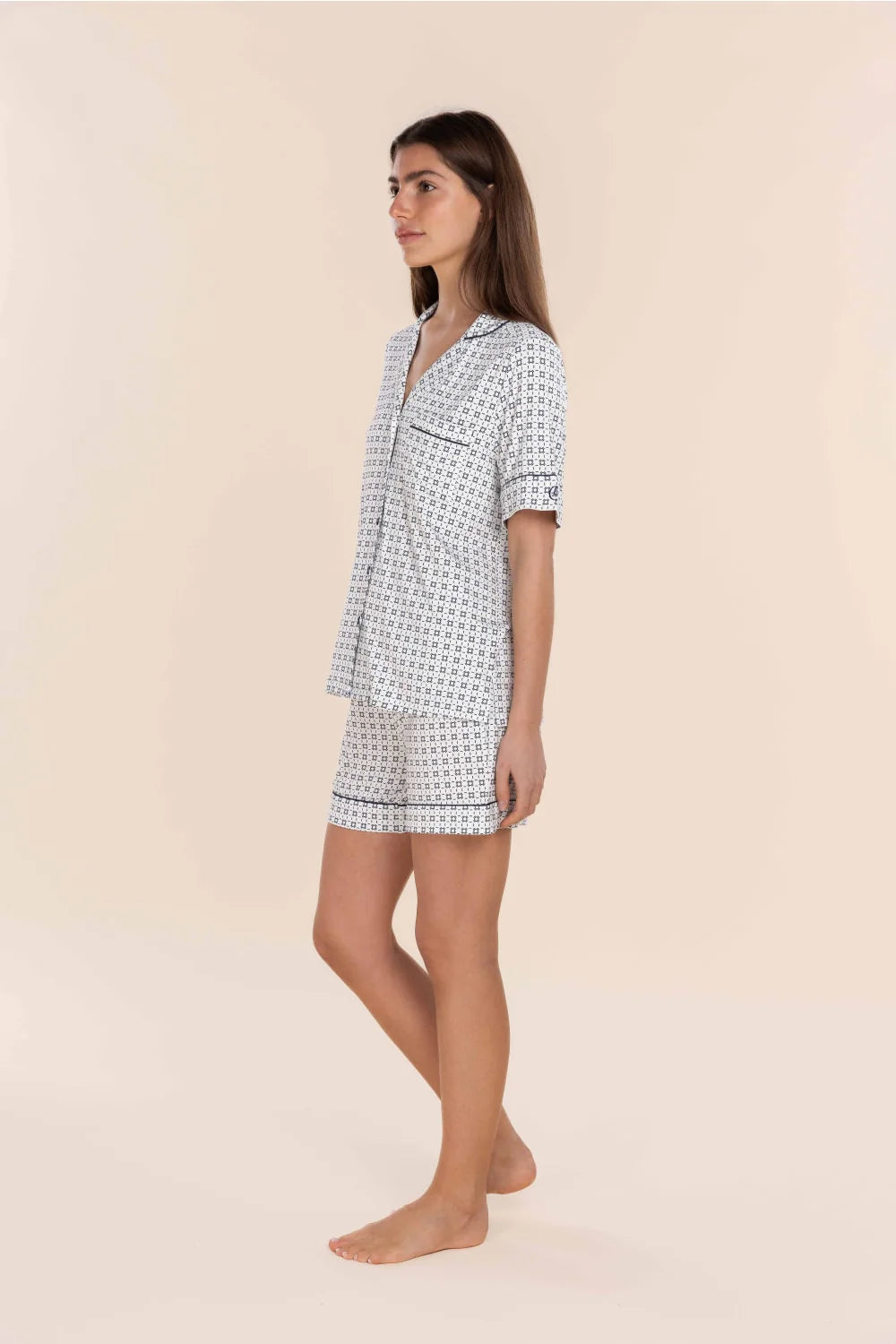 Sleep cooler, lounge longer ~ the Penelope Short Pyjama Set in geo navy is made from breathable bamboo, known for its silky touch and natural temperature control. This lightweight set promises softness that lasts through the night, keeping you comfortable in every season. The short-sleeve button-through top is paired with cuffed shorts designed without side seams, ensuring irritation-free wear. Finished with crisp white piping, it’s a timeless take on women’s bamboo pyjamas.