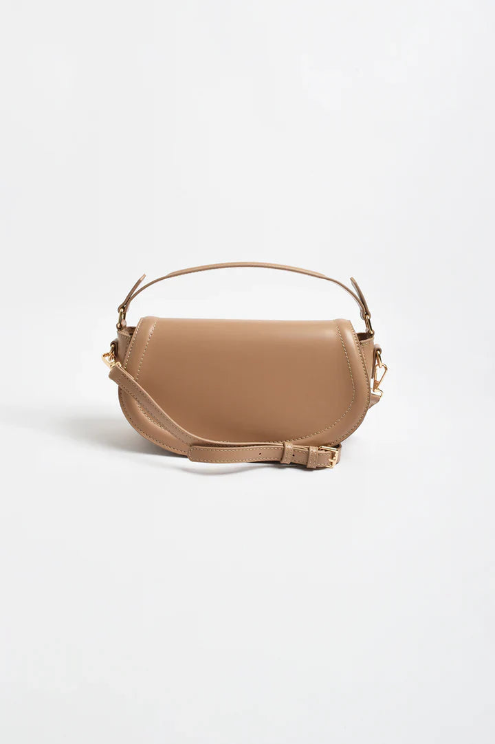 The Rosalie Rounded Fold Over Small Bag in Camel features a fold-over design with magnetic closure and gold hardware. It includes an internal zip pocket and an optional crossbody strap. Crafted from vegan leather and plated metal.